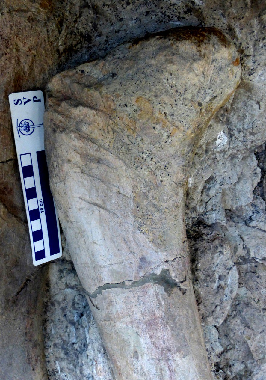 This could also have happened at least in part through transport too. Taphonomically the bone has an odd history, apparently isolated, it is actually very close to a second and near identical femur which suggests that both were from a single animal, but there are not other obvious comparable bones nearby and this suggests a very disarticualted carcass. Not only does the other femur lack any bite traces but these are essentially absent in the quarry as a whole. Of the huge number of bones present, only this small saurpod has any bites on it. That’s obviously really rather odd – if loads of carcasses were around, you might expect either tons of bites from theropods getting stuck into the wealth of food or almost none because feeding carnivores avoided biting bones when there was lost of muscle, or they simply couldn’t get to the bodies (if they were say underwater). But one bone badly bitten when even it’s companion wasn’t and then nothing else, is clearly an oddity. It suggests some odd circumstance where this one bone was, perhaps temporarily, accessible to a feeding theropod though the exact details of what may have happened are irrelevant, it does add a level of intrigue to this case.